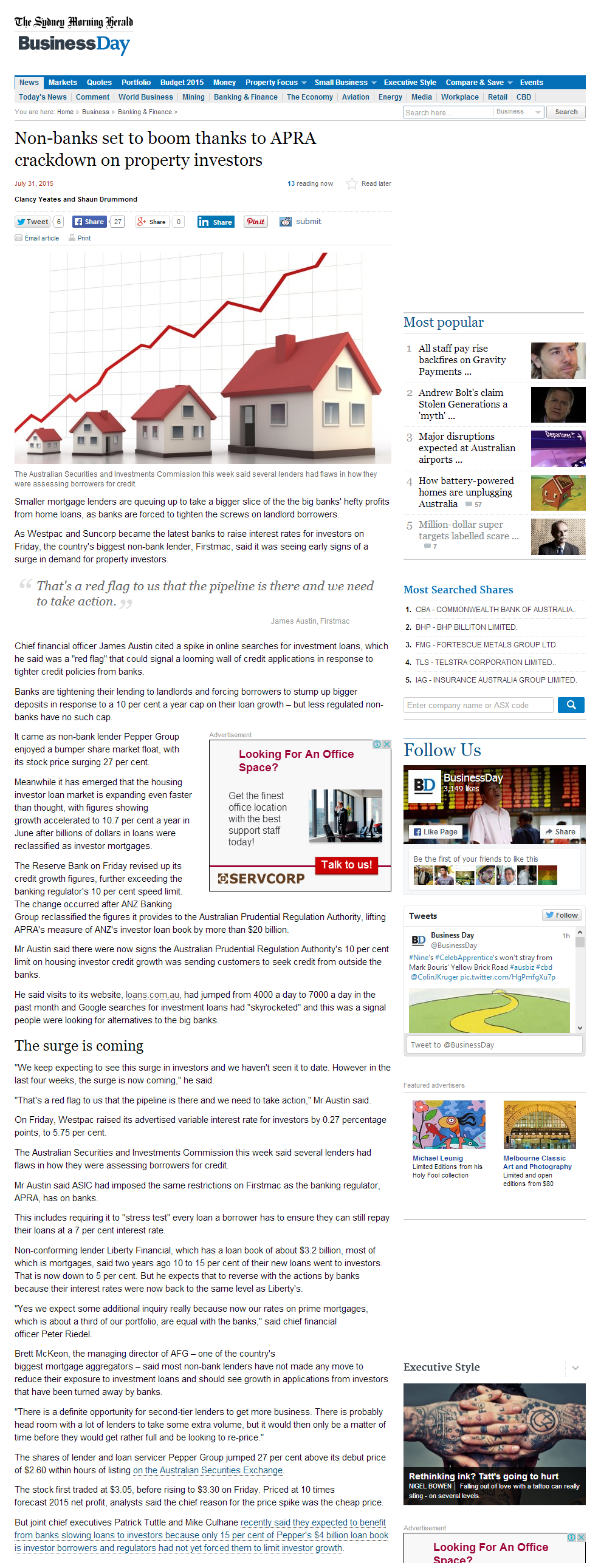 As Westpac and Suncorp became the latest banks to raise interest rates for investors on Friday, the country's biggest non-bank lender, Firstmac, said it was seeing early signs of a surge in demand for property investors.- Sydney Morning Herald.